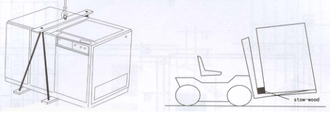 1、安装前应检查包装箱是否完整无损,并检查机组有无损坏。开箱后机组的搬运安装工作要按有关搬运注意事项严格进行,机组底座下面设有两个叉车孔,叉运时,应放置垫木以防叉车把机组门板压坏(见图2.1.1-1)。如果使用吊索,一定要用横杆,横杆可以抵消吊索产生压向箱体的侧面压力。注意:在吊索和机组隔声罩之间垫些保护材料的做法是不可取的,会把机组上面两侧门板压坏。